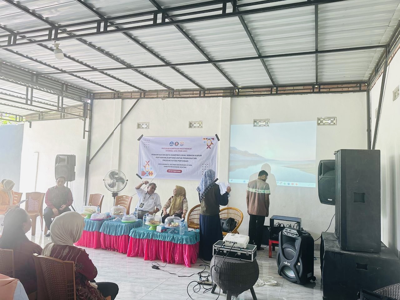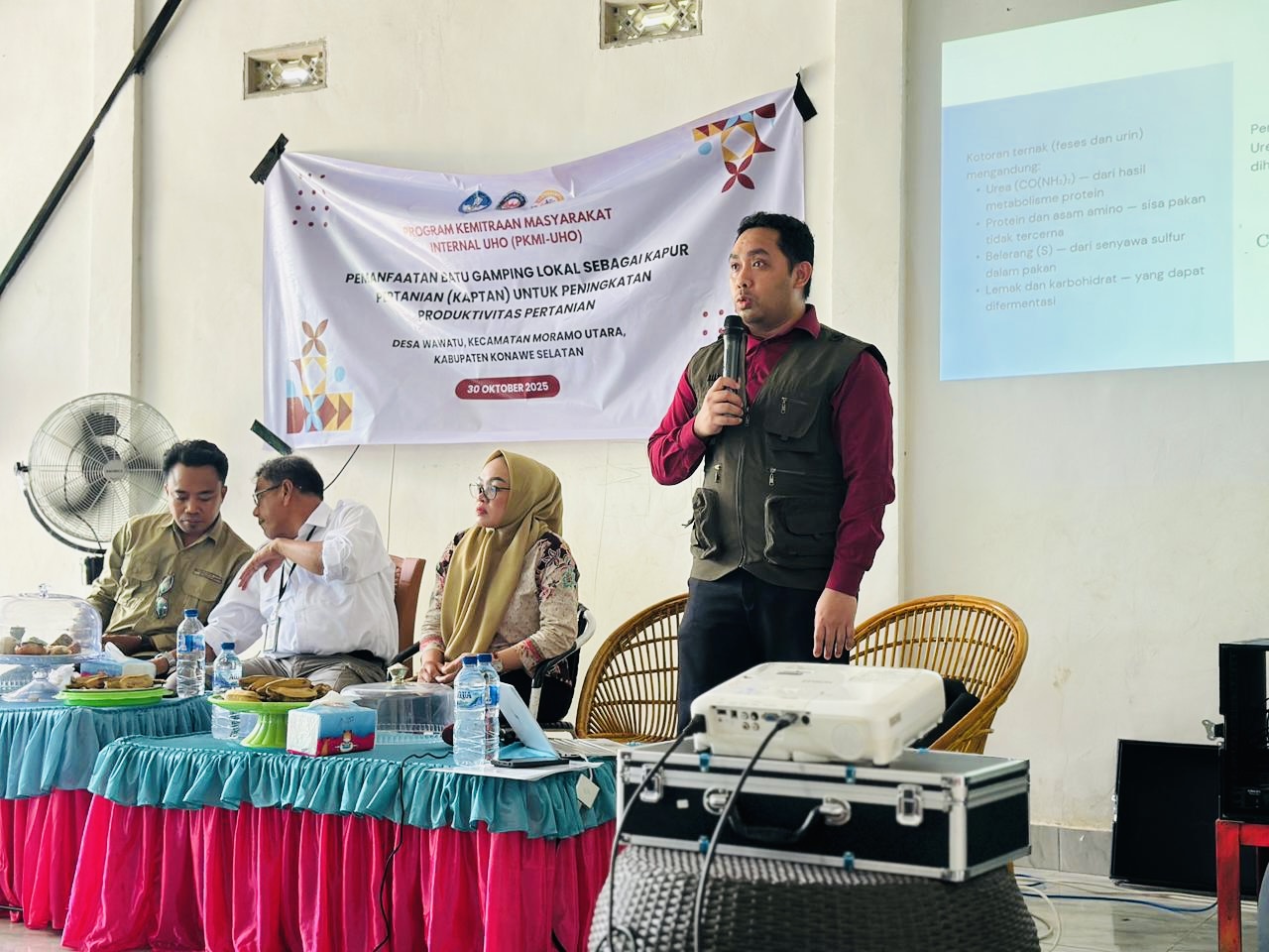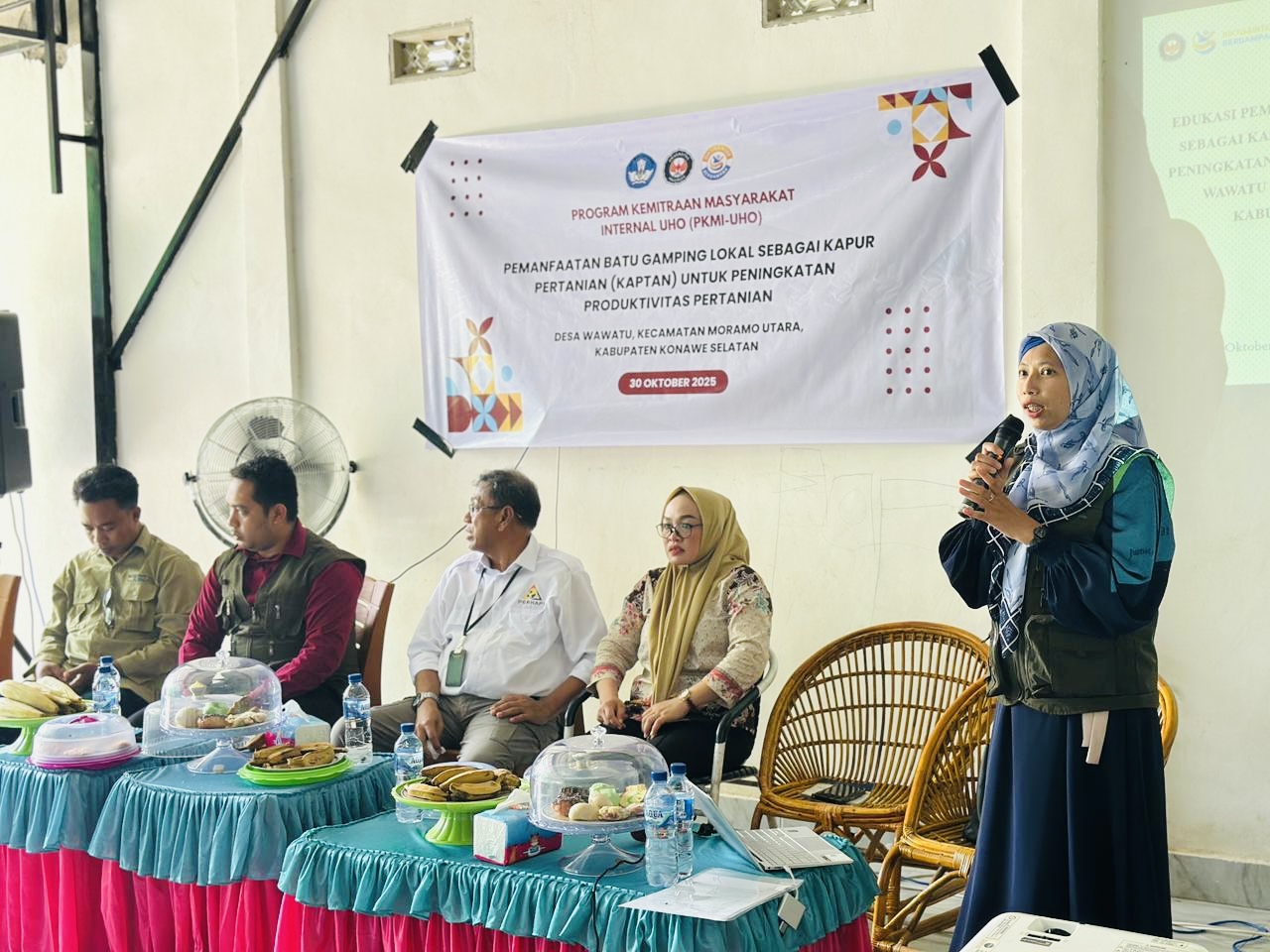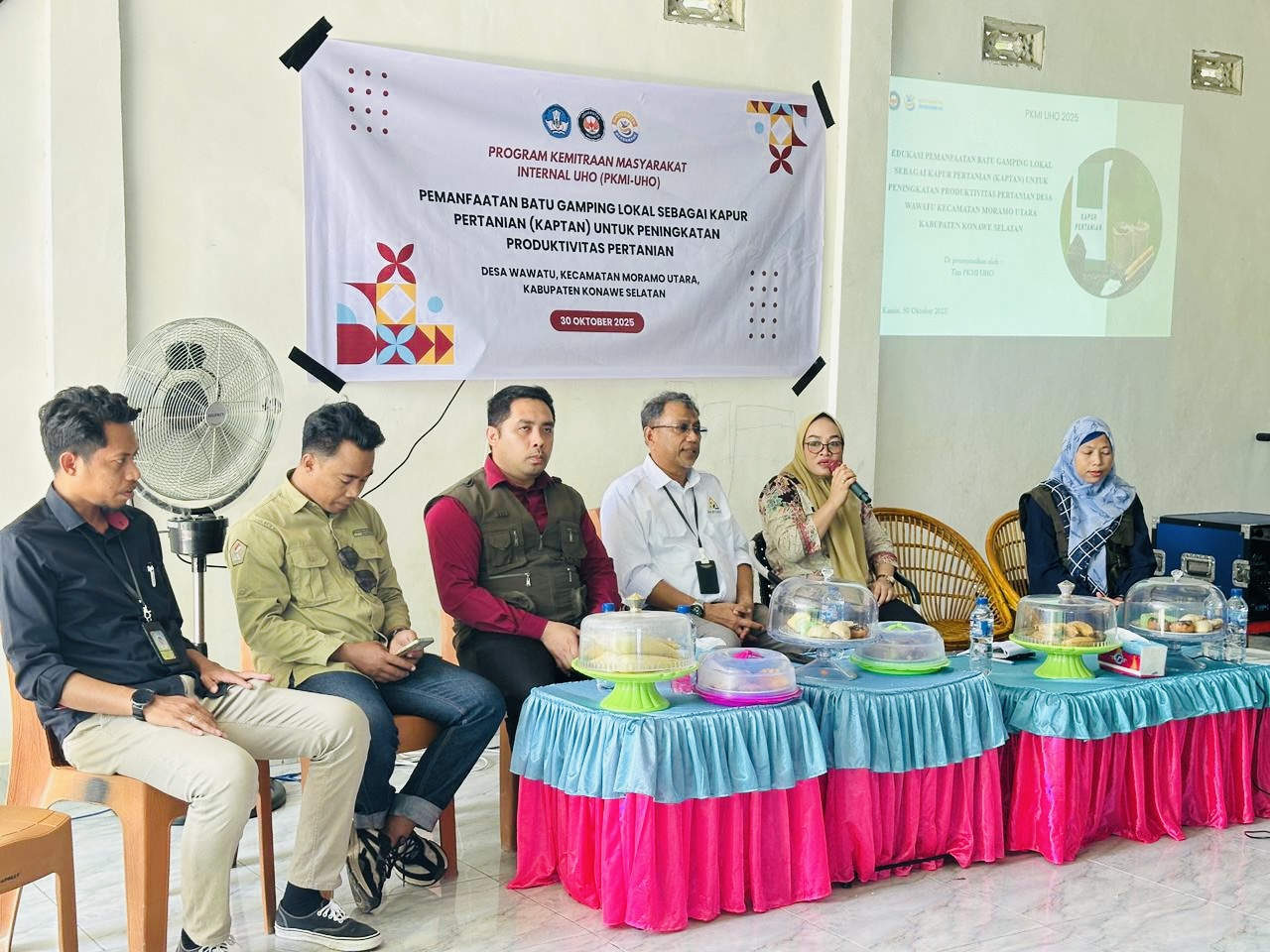 Sosialisasi dan pelatihan pemanfaatan batu gamping lokal sebagai Kaptan di Desa Wawatu, Kecamatan Moramo Utara, Kabupaten Konawe Selatan, Kamis (30/10/2025).
